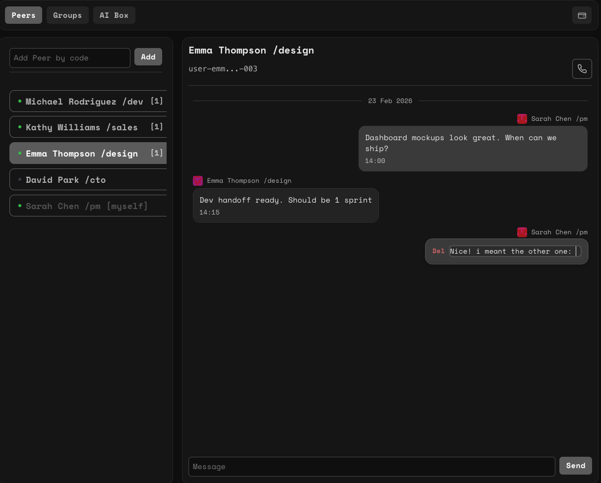One-on-one and group conversations, all end-to-end encrypted. Raw text never leaves the device — the server only handles ciphertext. Organize channels by team, project, or topic.
